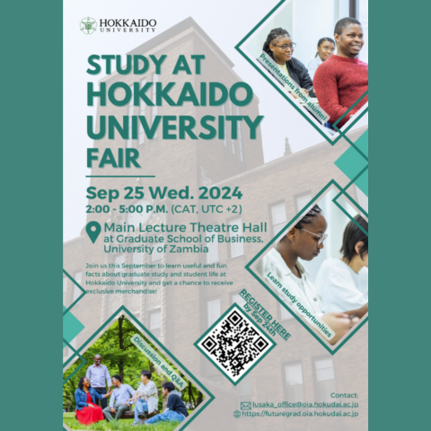 2024年9月25日にザンビア大学(ルサカ市)で北海道大学留学フェア(対面式)を開催します。ぜひお越しください。